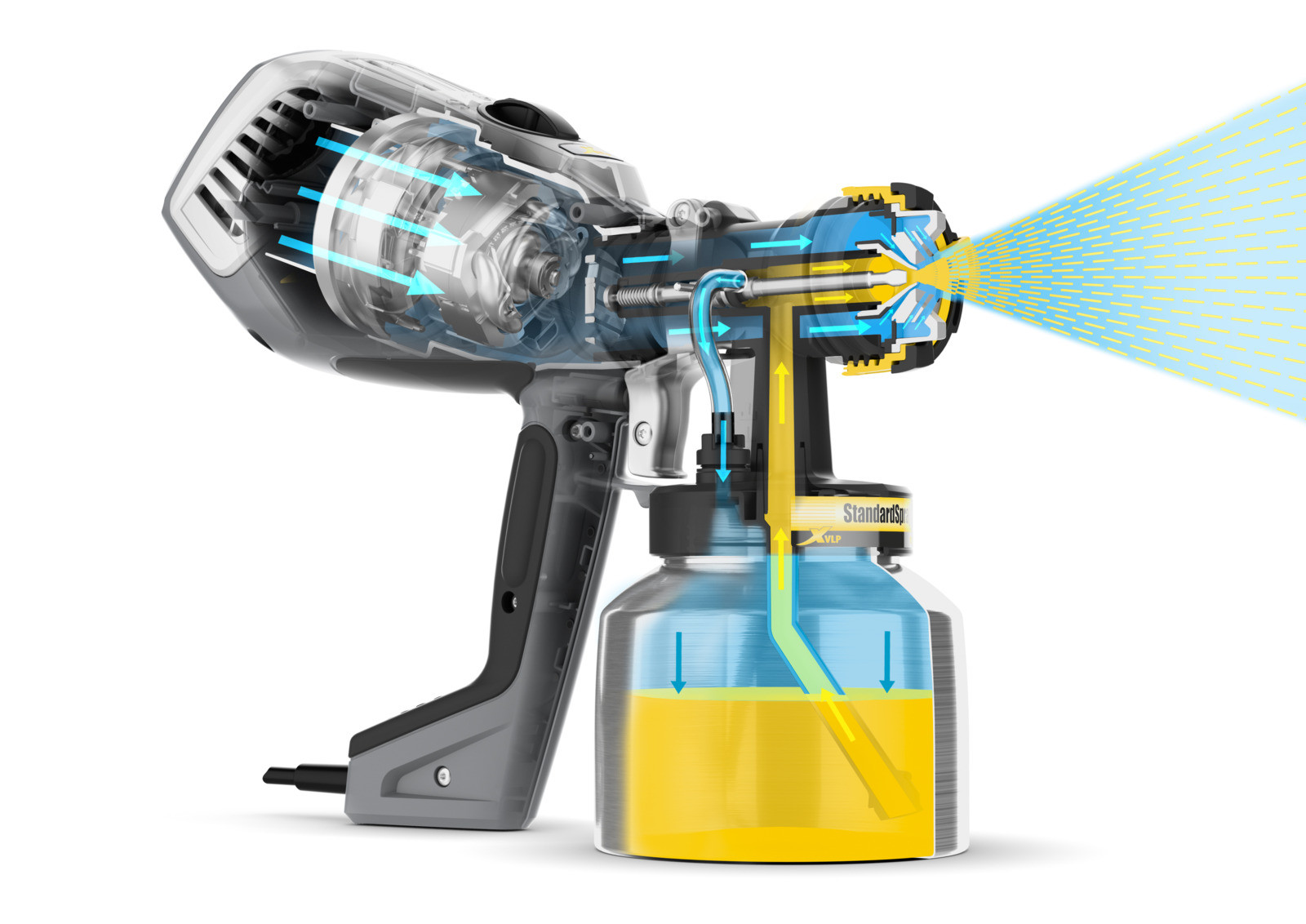FinishControl 3500 Plus est léger et maniable. L'appareil utilise la technologie XVLP (Extra Volume Low Pressure), une technique d'atomisation basée sur la technologie HVLP (High Volume Low Pressure), mais avec une capacité d'atomisation encore plus élevée. La pulvérisation est ainsi particulièrement fine et régulière.
